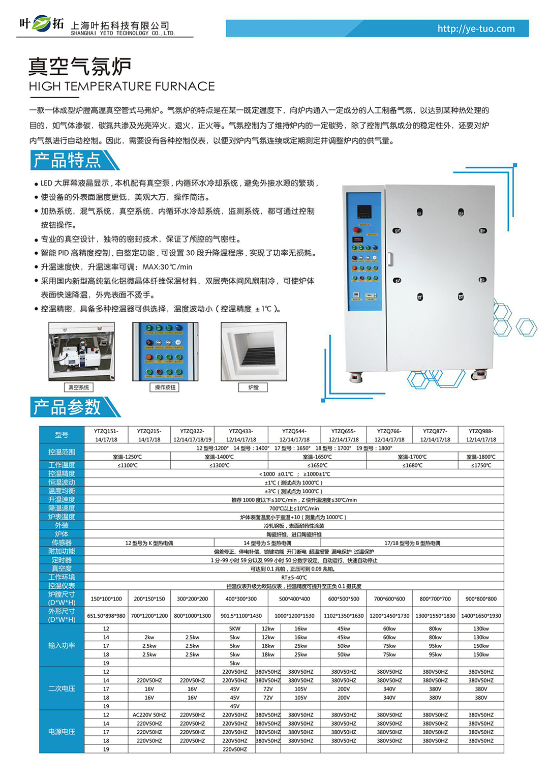 YTZQ系列是一款一體成型爐膛高溫真空管式馬弗爐。氣氛爐的特點是在某一既定溫度下,向爐內通入一定成分的人工制備氣氛,以達到某種熱處理的目的,如氣體滲碳,碳氮共滲及光亮淬火,退火,正火等。氣氛爐主要有以下特點:密封性為了控制爐內的氣氛,維持爐內的壓力,爐內工作空間始終要與外界空氣隔絕,盡量避免漏氣和吸入空氣,故要求爐殼,砌體,爐門及所有外界連接零件如風扇,熱電偶,加熱元件等采用密封裝置;氣氛控制為了維持爐內的一定碳勢,除了控制氣氛成分的穩定性外,還要對爐內氣氛進行自動控制。因此,需要設有各種控制儀表,以便對爐內氣氛連續或定期測定并調整爐內的供氣量。